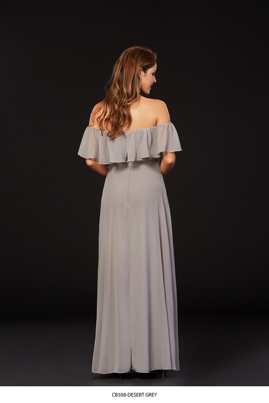 Simple yet stunning bridesmaid gown at a price your bridesmaids can afford. Off shoulder layer at neckline & A-line skirt. The fabric is chiffon, lined with a jersey so comfort level is high.