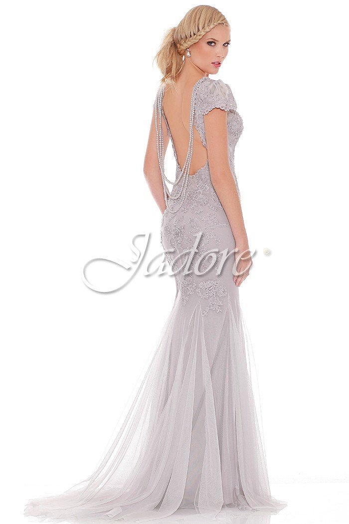 Floor length gown from Jadore. Fit & Flare lace gown features fitted bodice with bateau neckline, low back and cap sleeve. Elegant tulle & lace wedding gown.