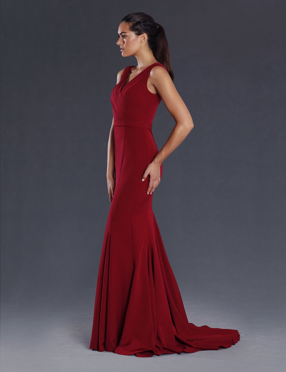 An elegant full length gown in a luxurious stretch fabric by Jadore. Featuring a wide V neckline. The elegant fit and flare silhouette also features godets inserted into the seams for extra flare. This gown is perfect for any special occasion; mother of the bride (or groom), or evening dress for ball or school formal.