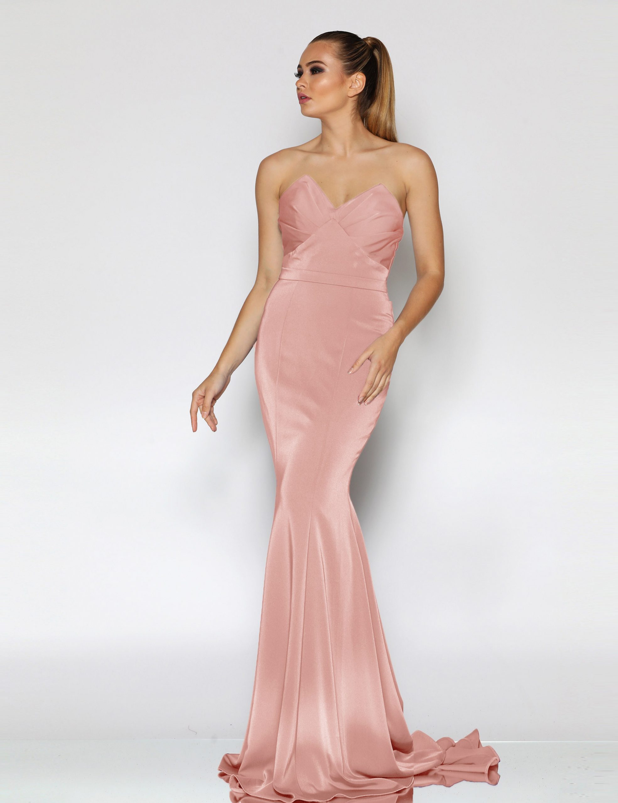 An elegant full length gown in a luxurious stretch satin by Jadore. Featuring a pointed sweetheart neckline and narrow waistband. The elegant fit and flare silhouette also features pleating over the bust and a short train. The gown is fully lined and a contains boning and moulded cups.