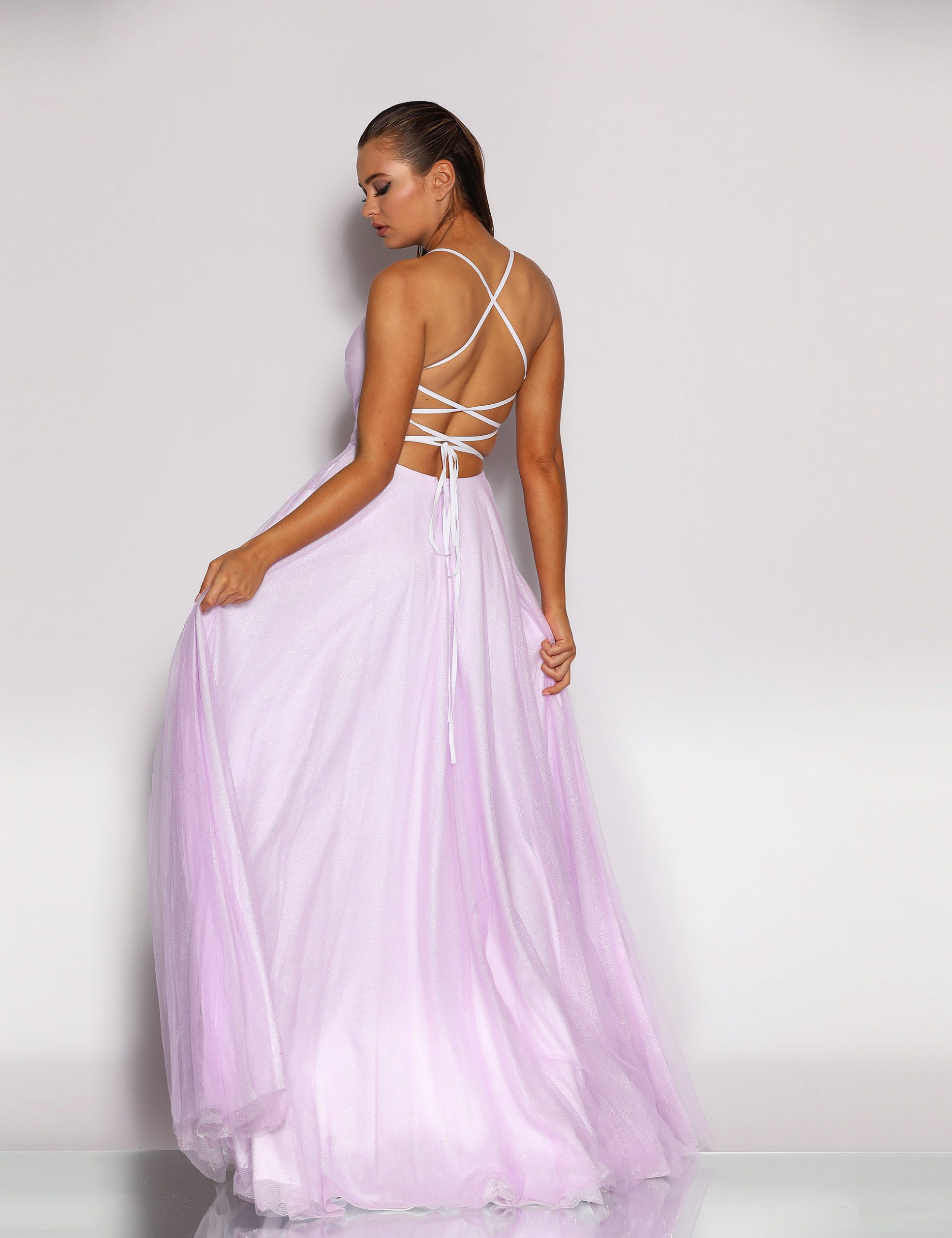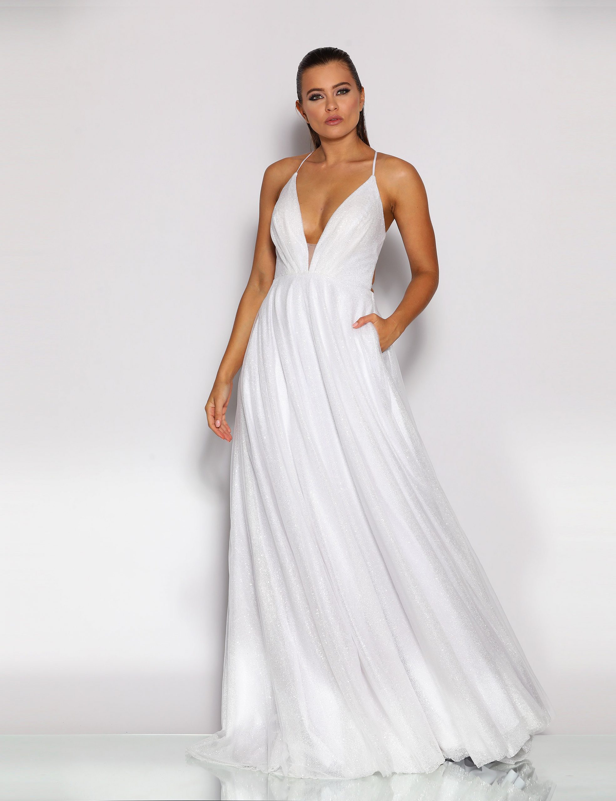 This bridal/formal gown by Jadore is floor-length and features a tulle skirt with plunging v neckline and low lace-up back detail. The gown features a sparkle tulle. The skirt can be worn with a hoop petticoat for a fuller look.