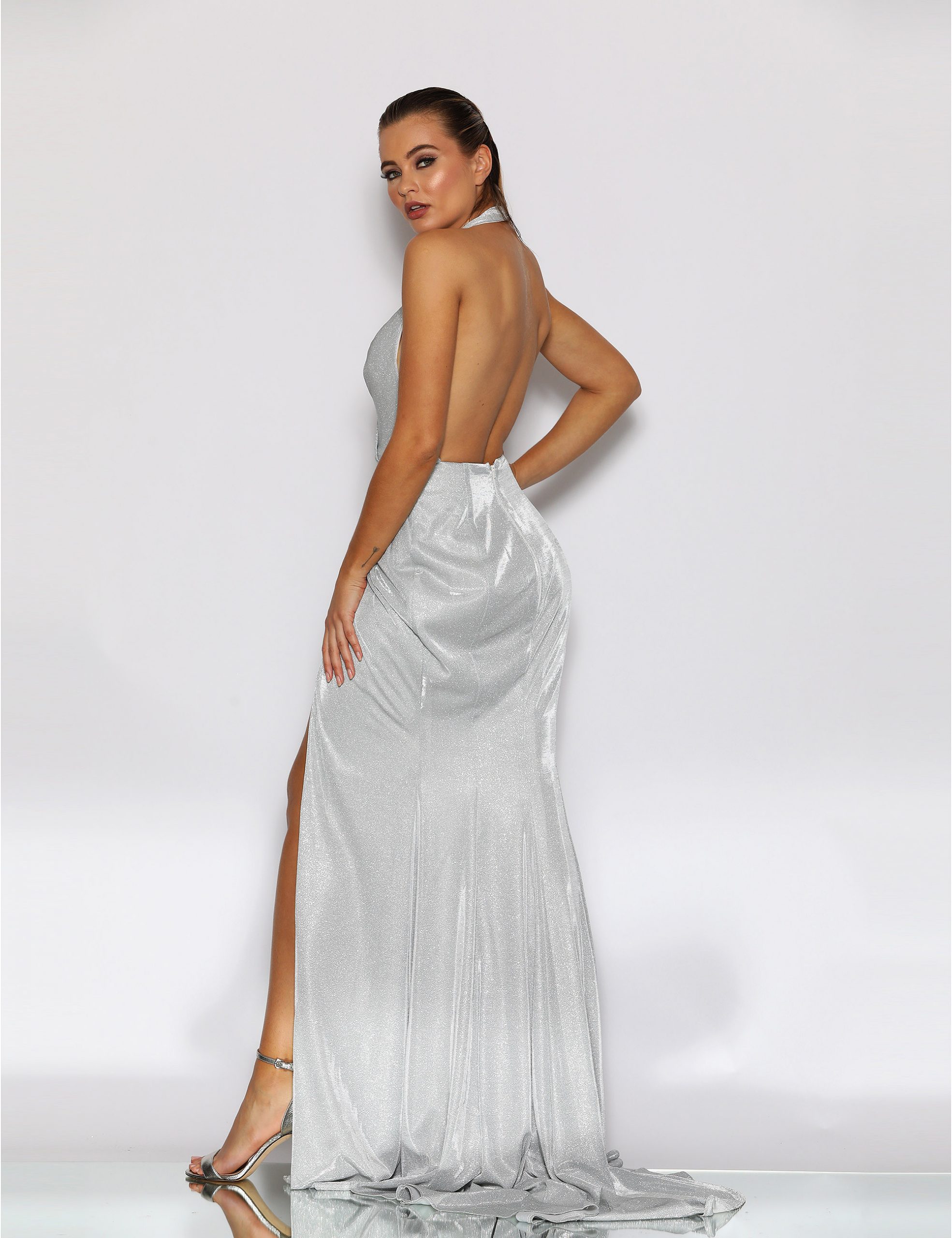 Jadore style JX2108 is an Elegant full length shimmery formal gown with halter neckline and low back. The gown also features an elegant leg split.