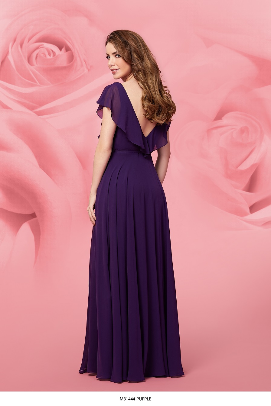 Simple yet stunning bridesmaid gown at a price your bridesmaids can afford. Cross-over bodice featuring chiffon flounce around neckline. The A-line skirt is a soft chiffon and the waist features a delicate wrap-around tie. The fabric is chiffon, lined with a jersey so comfort level is high.