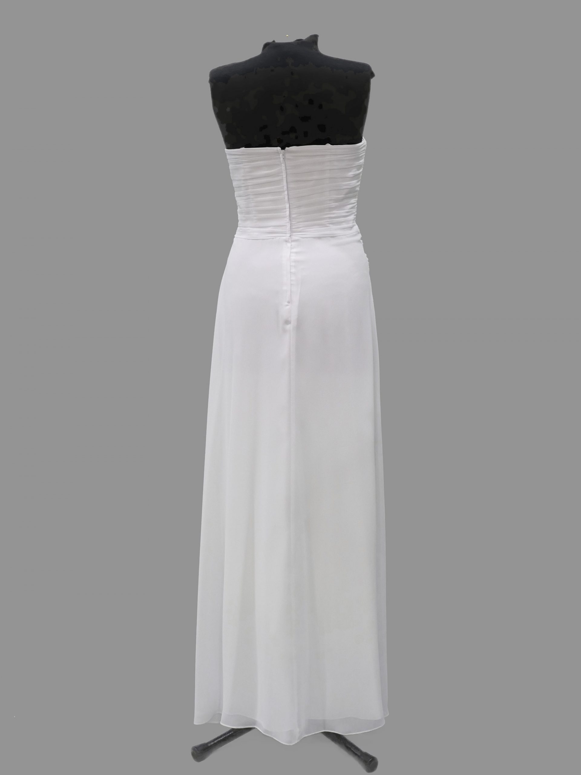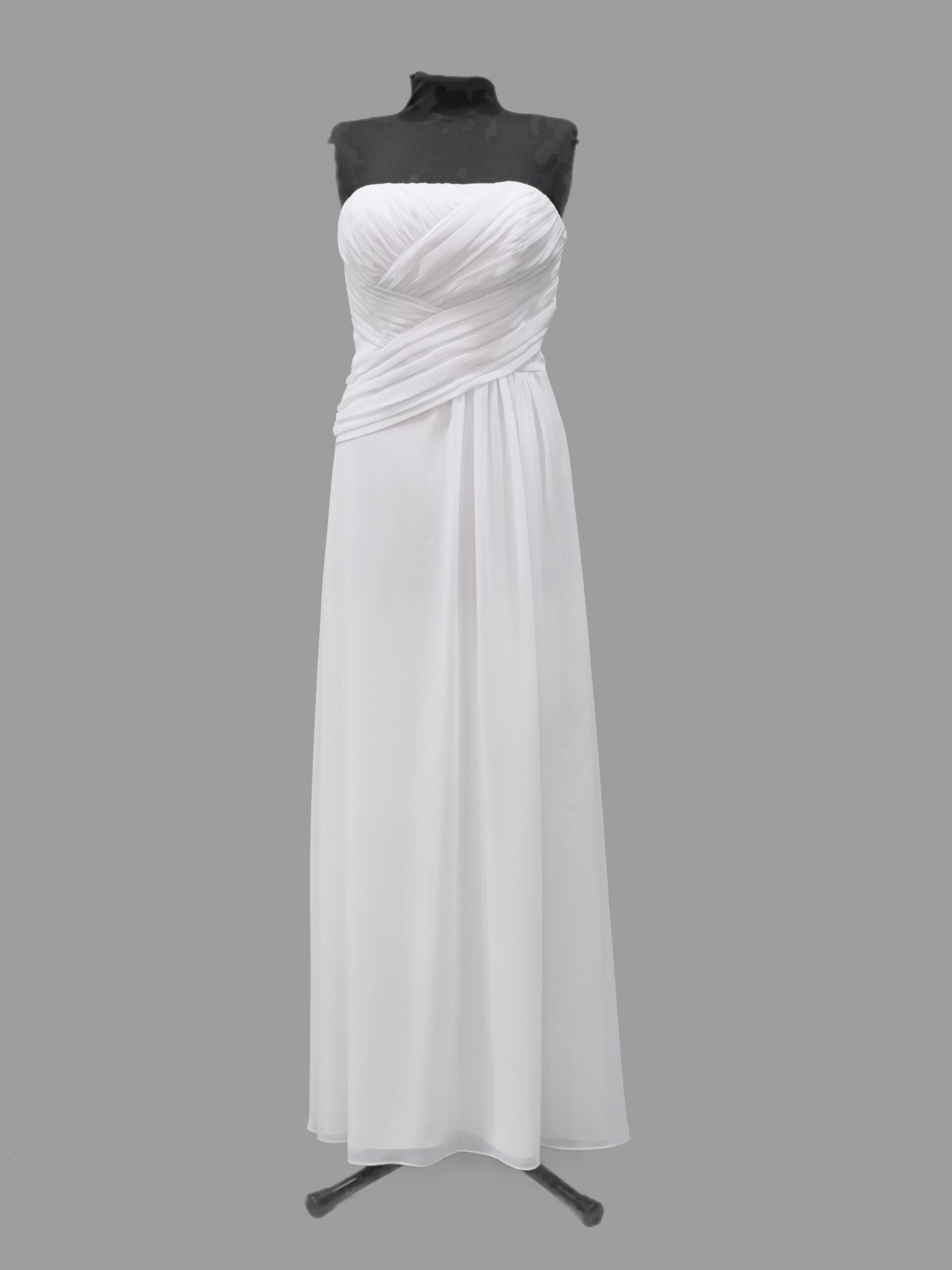 White Chiffon Debutante gown featuring strapless, fitted bodice and center back zip enclosure. The criss cross ruching, crosses over the bodice and complements the figure. The soft chiffon skirt is gathered in the front of the gown.