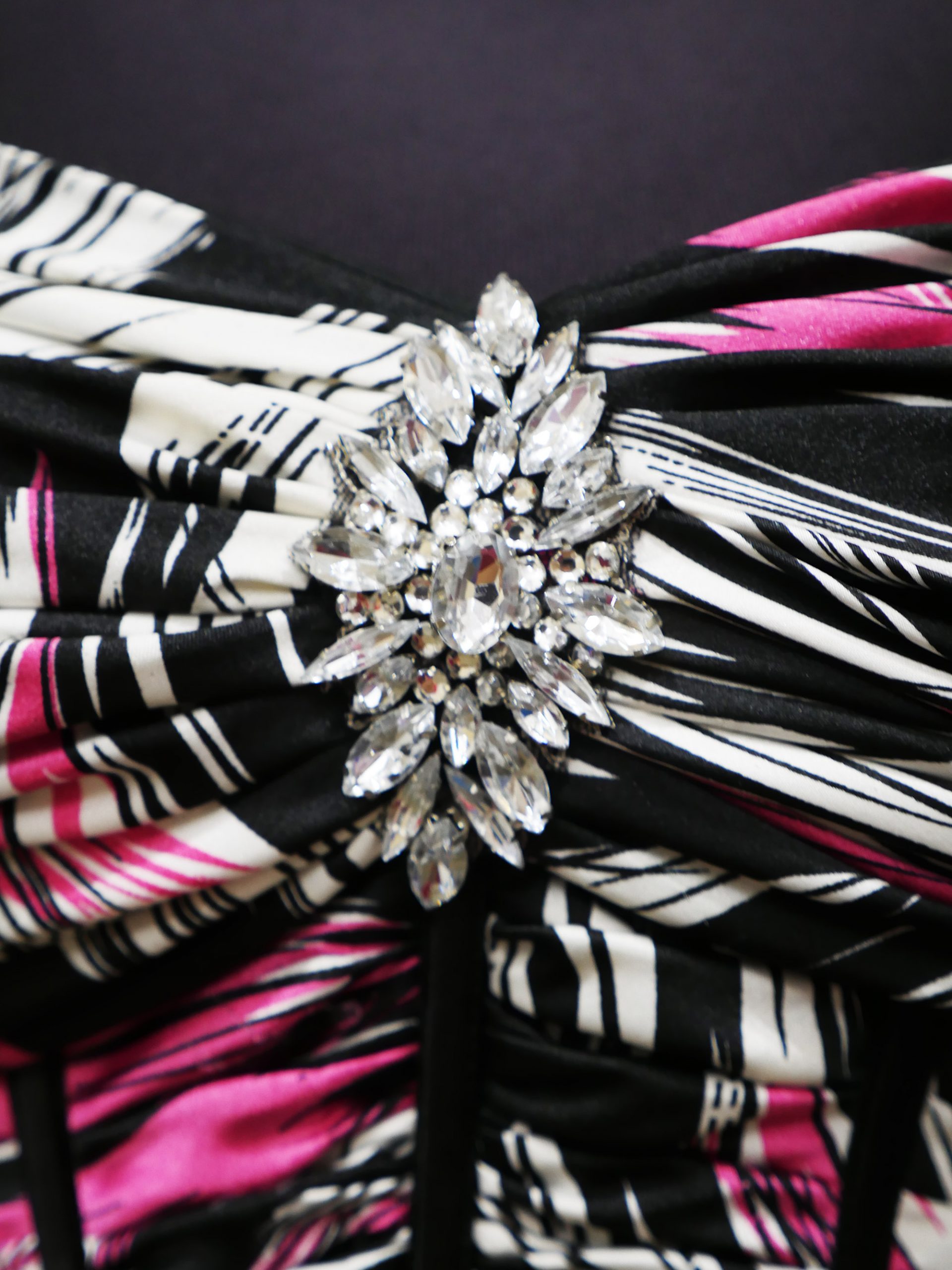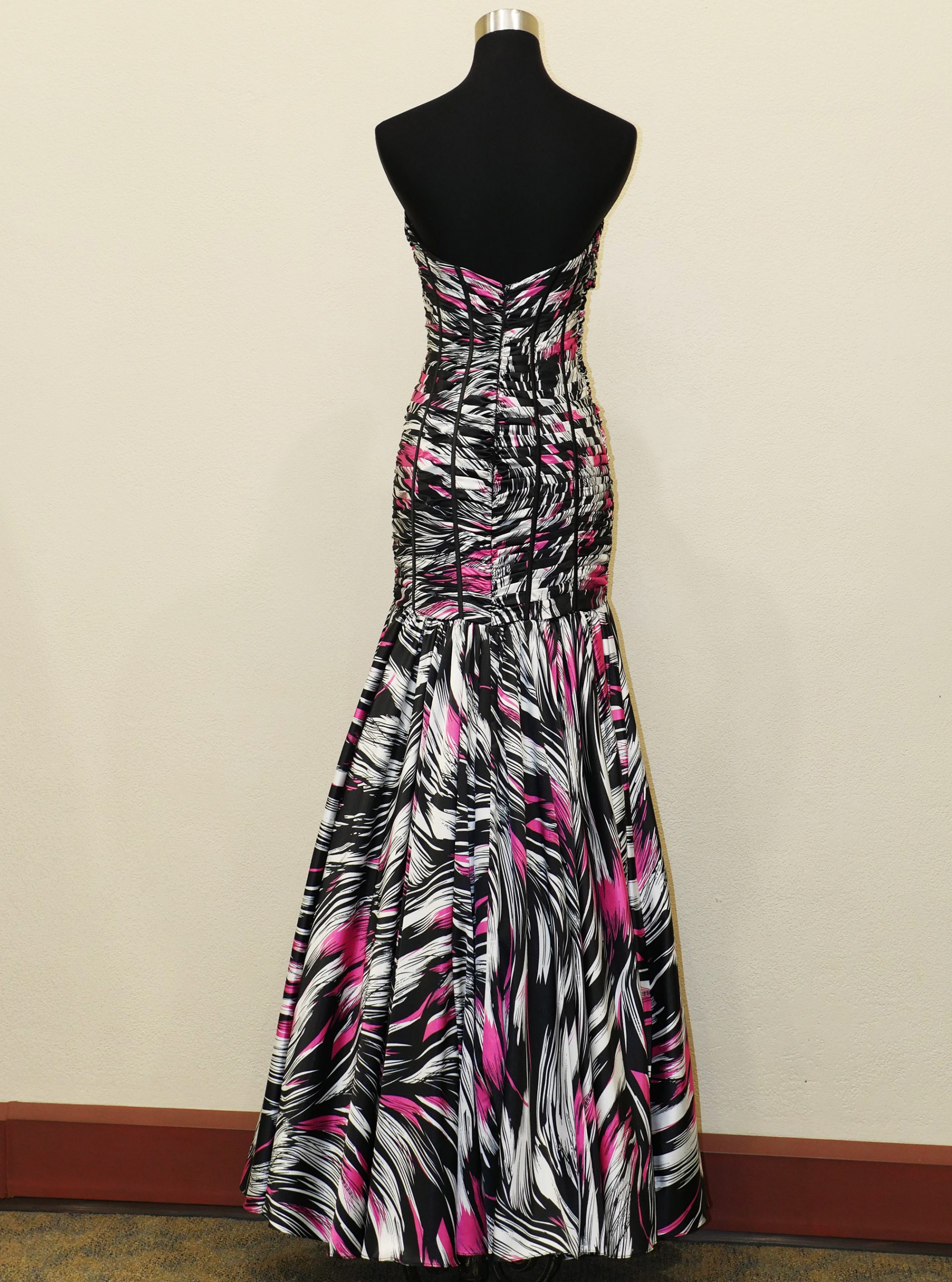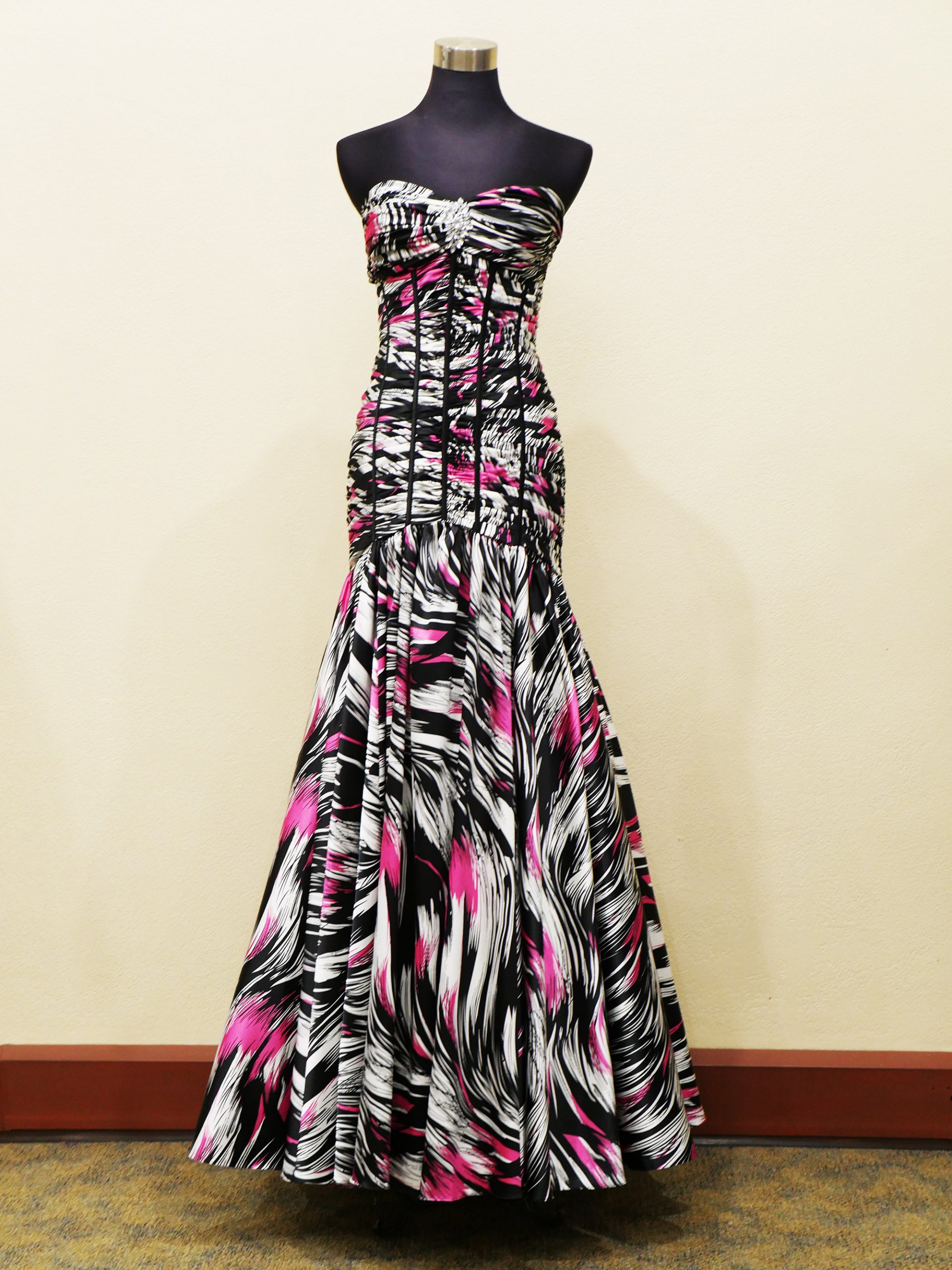 This printed charmeuse formal gown in “brushstroke” print has a striking supermodel look. The fitted boned bodice is ruched and very flattering. It has the effect of lengthening the body. The full skirt gives the fishtail silhouette (which is very popular).