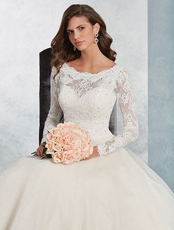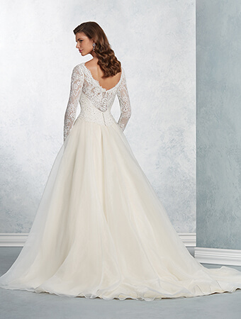 Sheer, full-length sleeves and a Chantilly lace overlay bodice give this classic wedding dress an old world grace. The full, circular organza skirt sweeps into a semi-cathedral train.